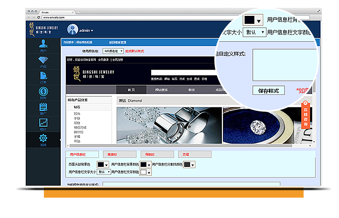 网站主色调和副色调均可自由设定,用户信息栏、搜索栏、导航栏、页尾,可以任意选择背景颜色、文字颜色及大小、搜索栏文本框及按钮颜色等细节调整,做属于自己的特色电商平台。